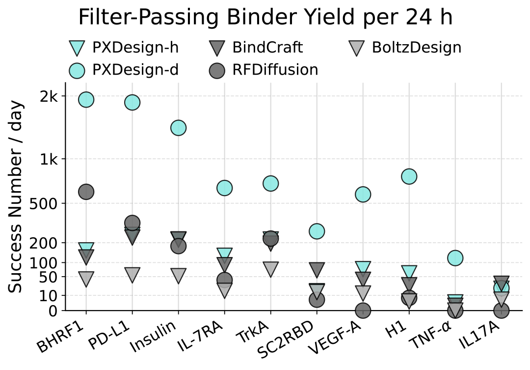 在实际测试中,PXDesign展现出极高的效率,24小时内即可生成数百个高质量的候选蛋白,生成效率较业界主流方法提升约10倍,并在多个靶点上实现了20%–73%的湿实验成功率,达到了当前领域的领先水平。