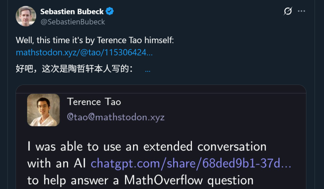 9月初,他将GPT-5用于半自动化文献检索,使Erdos问题/OEIS关联项目首次得到概念验证;