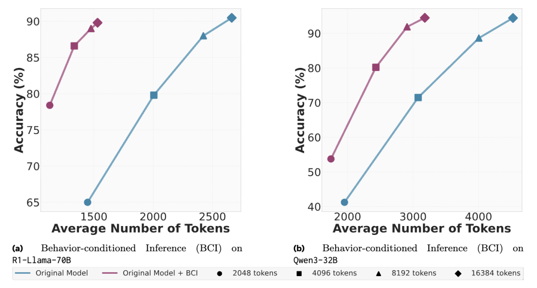 实验结果显示,该机制通过行为条件推理、行为引导自我改进、行为条件监督微调三种应用场景,在MATH、AIME等数学基准测试中实现了显著优化,在保持准确率不变的前提下,最多可减少46%的推理token使用量。