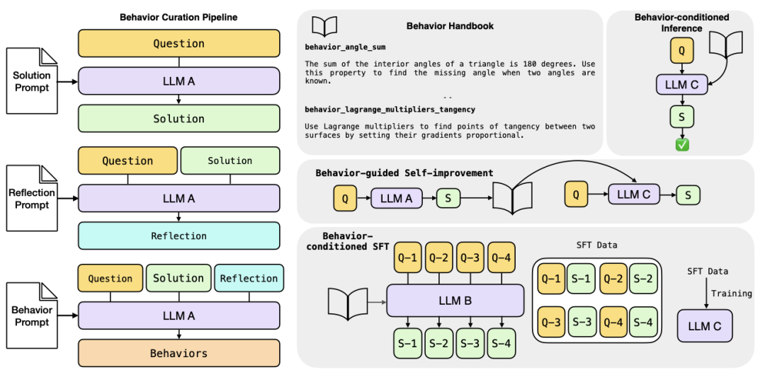 这些“行为”会被收录进一本可检索的“行为手册”,既能在测试阶段通过上下文提示直接调用,也可通过监督微调内化为模型的固有能力。