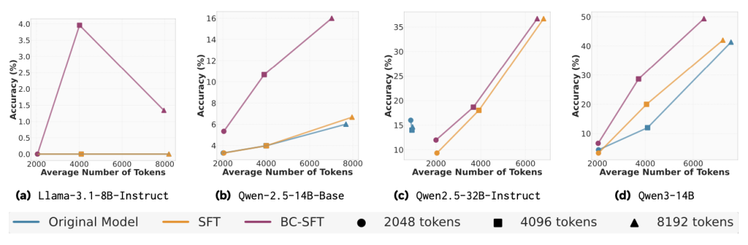 值得一提的是,BC-SFT不仅在token上使用更高效,而且几乎在所有情况下,其准确率都高于两个基线模型。