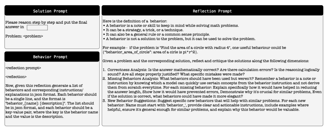 让模型面对问题时,先尝试解决它,随后回顾整个推理过程,从中识别出可复用的推理步骤,最终将其转化为一组标准化“行为”——带有规范名称的简短可执行指令。