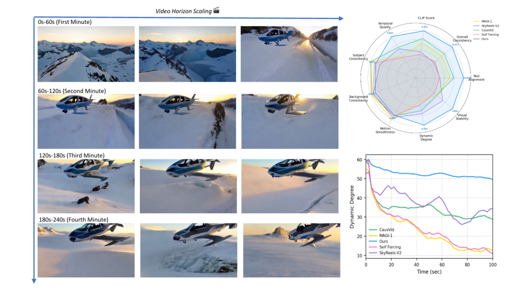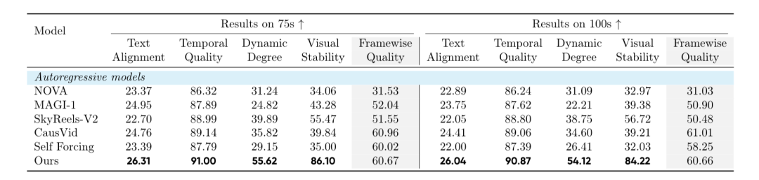 而在75秒到100秒生成中,文本对齐得分可达26.04、动态程度为54.12,相比CausVid分别提升6.67%和56.4%,相比Self-Forcing则提升18.36%和104.9%。