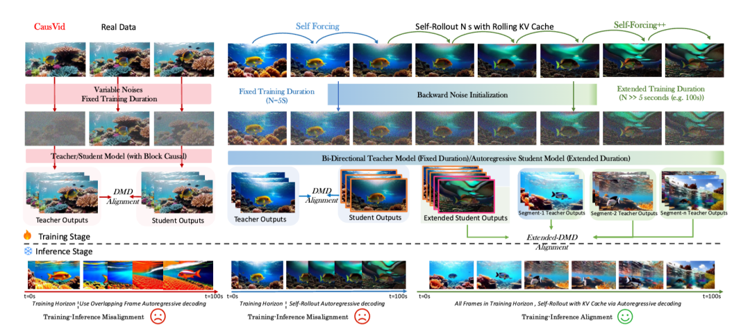 于是针对这一问题,字节提出Self-Forcing++方法抑制后期质量下降,不再依赖长视频教师模型训练,而是让模型在自己的错误中成长。