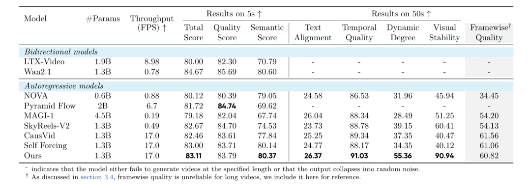 研究人员主要设计了两类场景评估,分别对比该方法与基准模型(包括自回归模型与双向模型)在短时长视频质量和长时长生成上的效果。