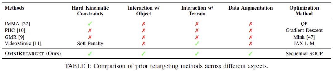 在与其他动作重定向方法的对比中,OmniRetarget在所有关键方面:硬约束、物体交互、地形交互、数据增强表现出了全面的方法优势。