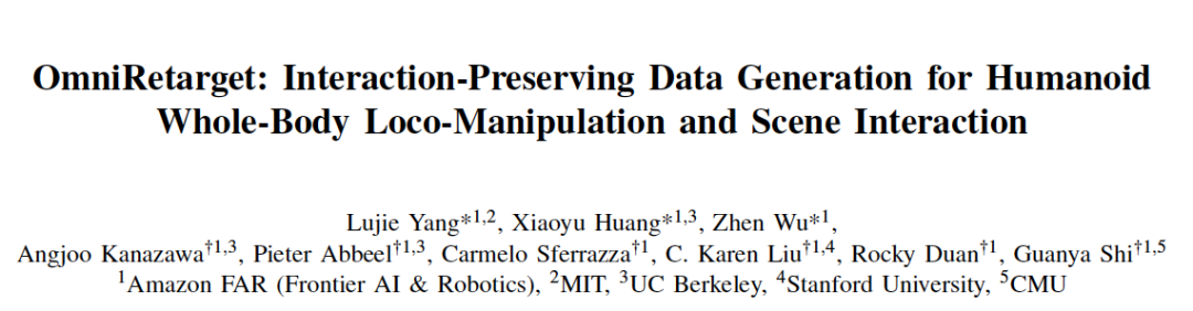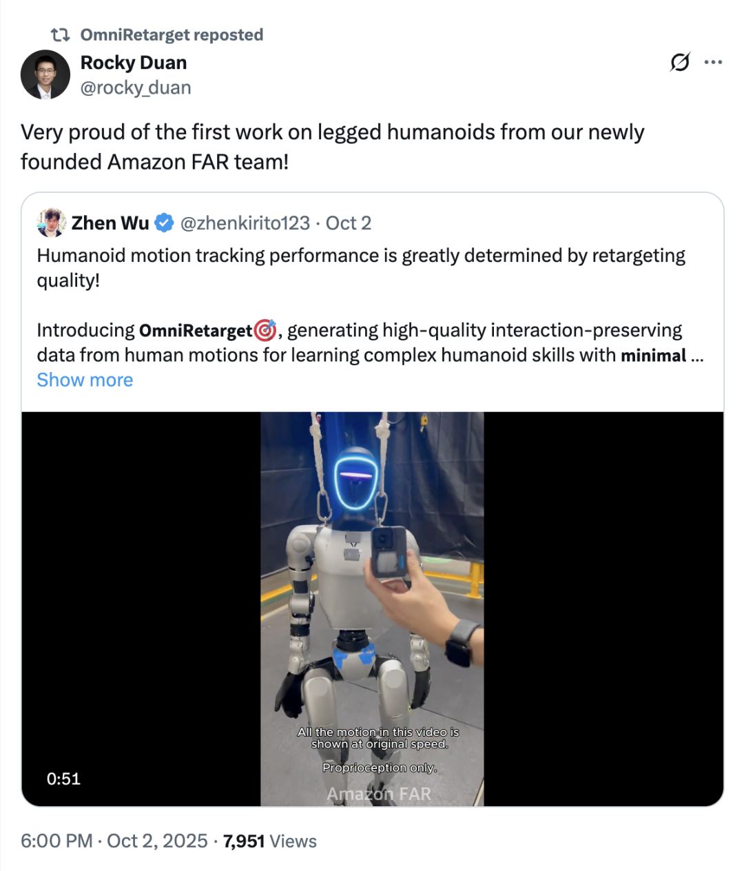 值得一提的是,OmniRetarget背后的Amazon FAR (Frontier AI & Robotics)成立仅七个多月,由华人学者领衔。
