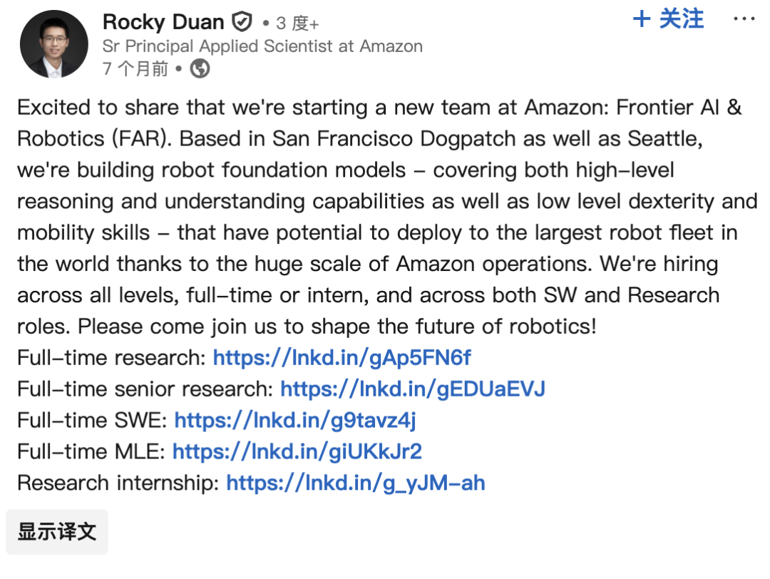 目前,由Rocky Duan担任Amazon FAR研究负责人。
