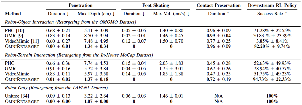 实验结果显示,在运动学质量上,OmniRetarget在穿透、脚部打滑和接触保留指标上整体优于所有基线,即使偶尔轻微穿透也能被 RL 修复。
