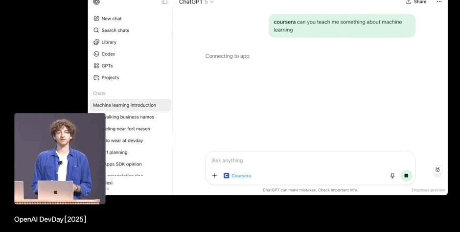 比如直接在ChatGPT 5的对话框中输入“coursera(一个提供网络公开课的App)教我机器学习知识”,ChatGPT就能立刻连接该App并提供相关课程: