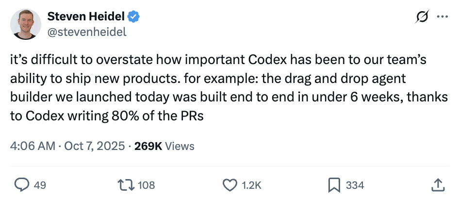 OpenAI研究员Steven Heidel在X上透露,最新发布的Agent Builder不到6周就完成了端到端构建,而Codex编写了80%的PR。