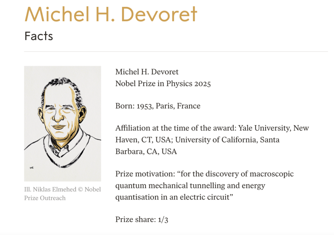 Michel H. Devoret长期致力于理解超导电路中量子非平衡物理的基本机制,并探索其在量子计算与量子传感等领域的应用,为当今量子科技革命奠定了坚实的物理基础。
