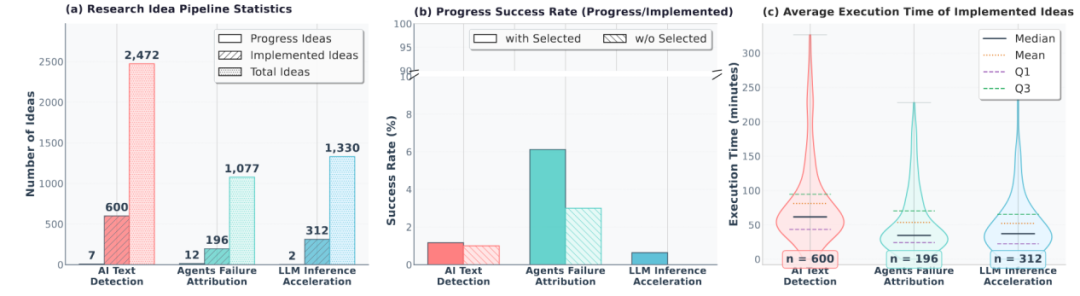 在此期间,DeepScientist自主生成了2472个独特的研究想法,并对其中600个具有科学价值的假设进行了代码实现和实验验证。