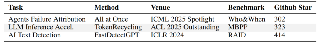 为验证DeepScientist的研究能力,研究人员将DeepScientist应用在三个当前AI研究的最前沿领域:智能体失败归因、LLM推理加速与AI文本检测 。