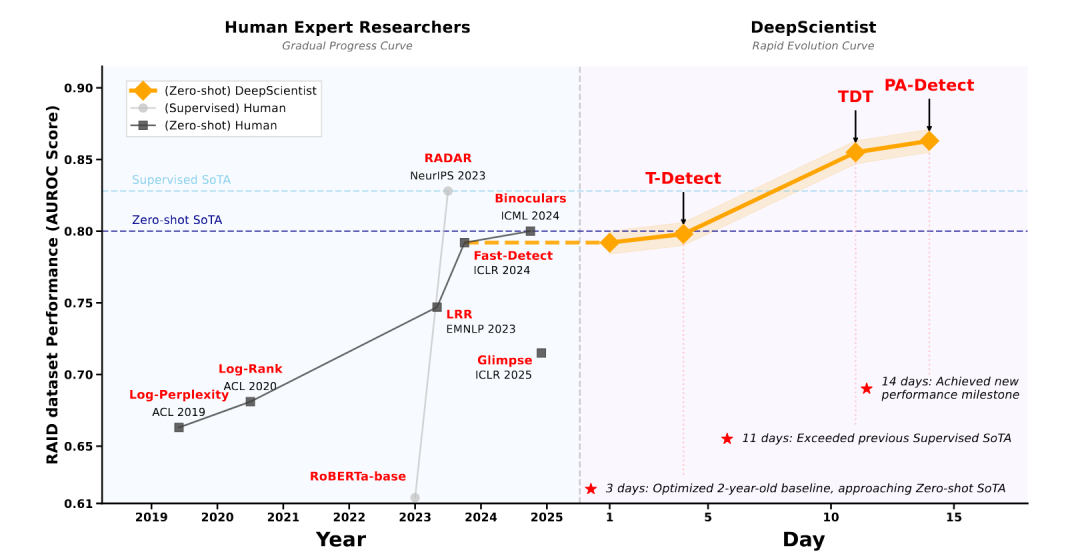 在RAID数据集测试中,DeepScientist设计的方法实现了7.9%的AUROC提升,成功超越了人类现有SOTA方案。