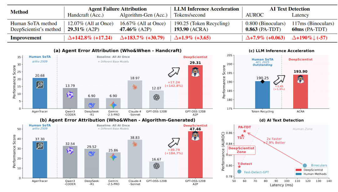 DeepScientist的突破性进展并不仅限于AI文本检测领域,它在多个不同的前沿任务上都展示了超越人类专家的科学发现能力,其中一个典型的例子是在“智能体失败归因”这一高度复杂的任务上。