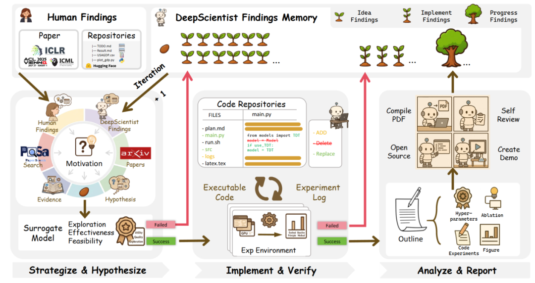 不同于依赖大规模随机试错的方法,DeepScientist通过形式化的分层贝叶斯优化机制,在“利用已有成果”与“探索未知可能性”之间灵活平衡,能够在庞大的假设空间中智能筛选出最具潜力的研究方向。