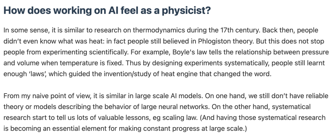 姚顺宇表示,作为一个物理出身的AI研究者,AI研究目前“不懂原理但能持续找到规律”的感觉,他非常熟悉,也很享受。