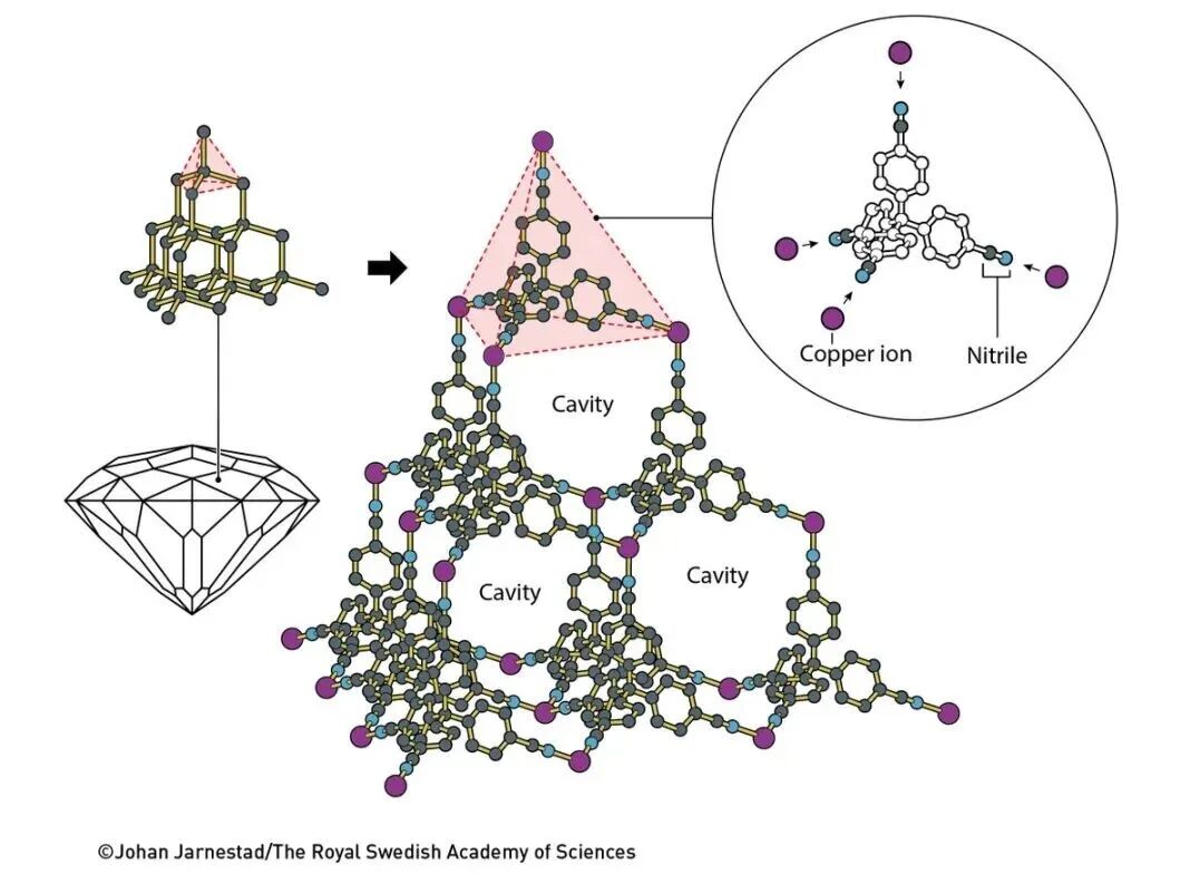 其中四臂分子组合形成化学基团,并在每个末端各吸引一个带正电的铜离子,整体来看,像一颗充满空腔的钻石。