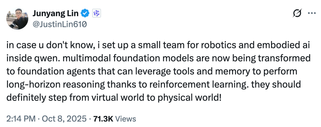 林俊旸在公开具身智能小分队的帖子中写道: