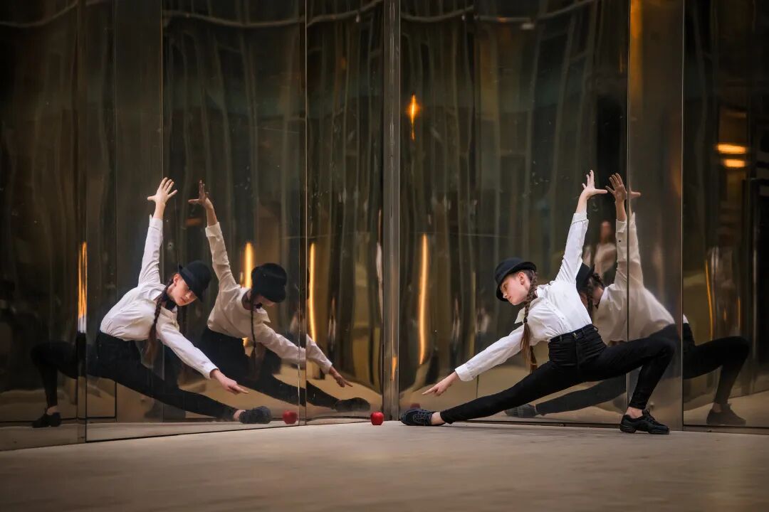 图中的女子在图中的舞蹈房内,从图片中的动作开始,翩翩起舞,动作流畅一致,镜面反射出舞蹈全景,镜头缓慢环绕捕捉舞蹈细节。