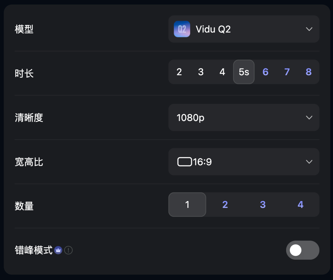 对生成视频的结果,我们还可以选择时长、清晰度、宽高比和一次生成视频的数量等: