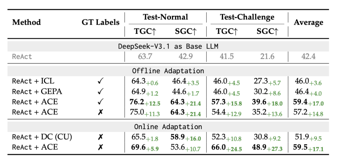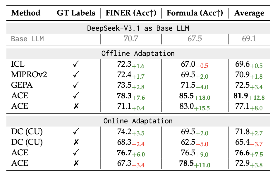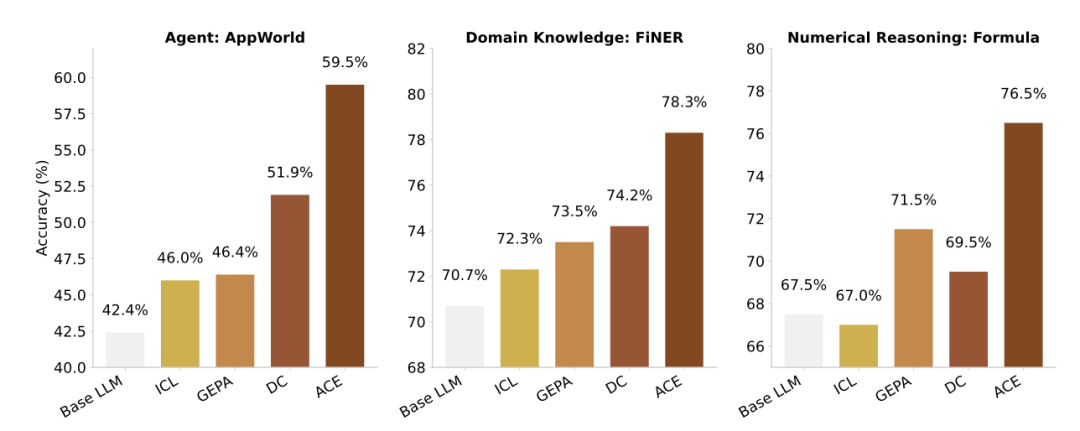 在智能体和特定领域的基准测试中,ACE能同时优化离线上下文(如system prompt)和在线上下文(如agent memory),并稳定优于强力基线模型。