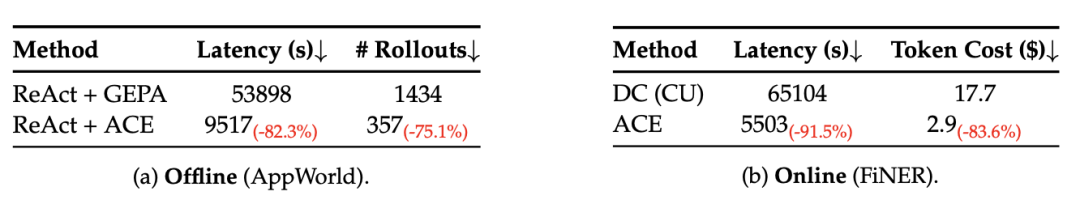 具体而言,在AppWorld的离线自适应任务中,与GEPA相比,ACE将自适应延迟降低了82.3%,并将尝试次数减少了75.1%。