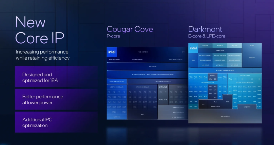 最关键的CPU核心上,全新的核心IP“Cougar Cove”性能核与“Darkmont”能效核,给出了极具吸引力的性能数据。