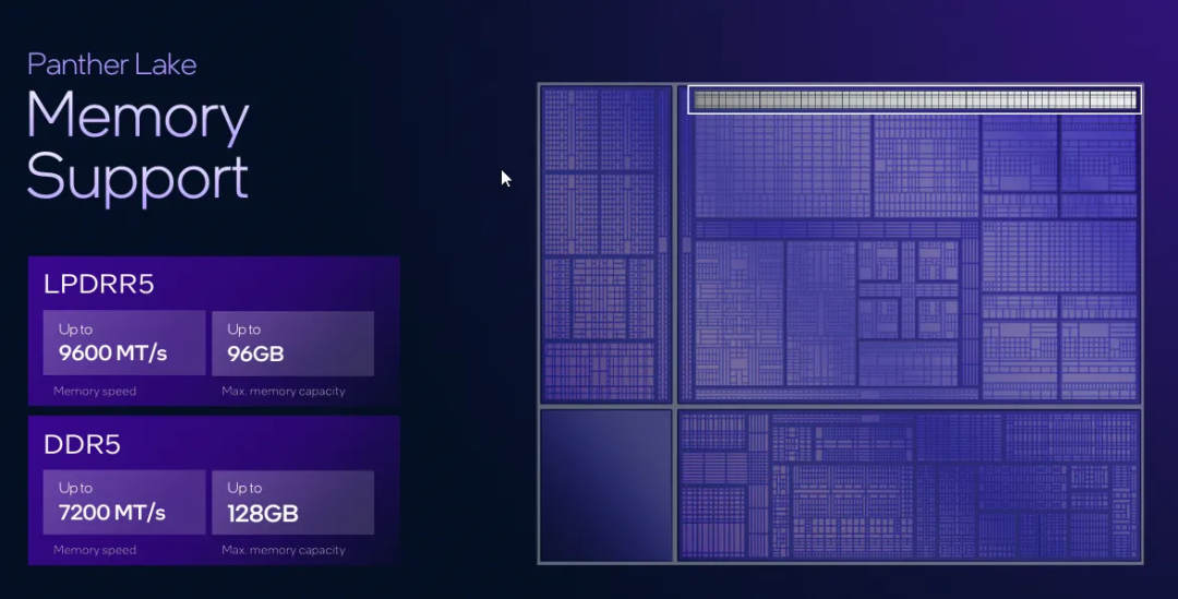 Panther Lake对缓存系统进行了重要升级,新增了8MB的内存侧缓存(Memory Side Cache),可将DRAM访问延迟降低30%,数据命中率高达95%。