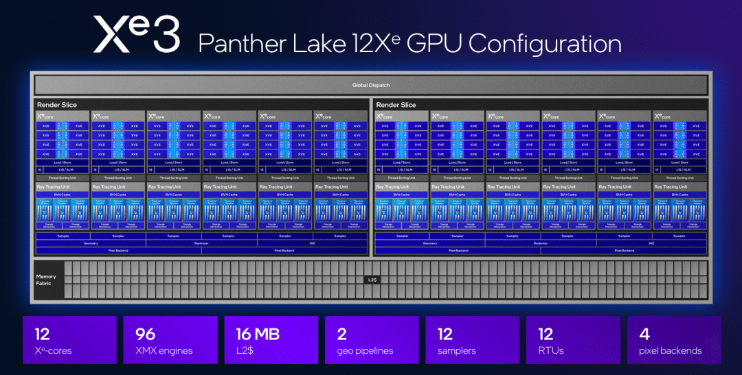 Xe3 GPU提供4核和12核两种配置,12核版本的GPU拥有12个光线追踪单元和96个XMX引擎,还配备了16MB的L2缓存。