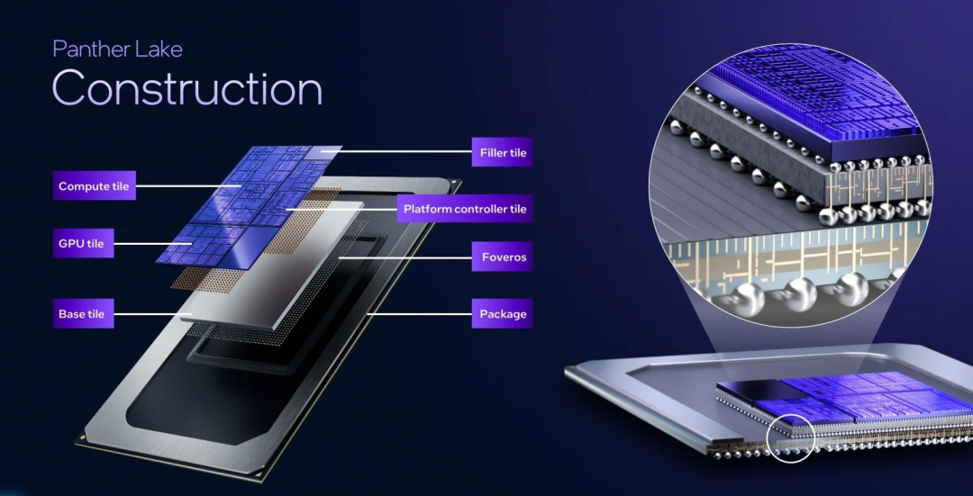 Panther Lake整体架构延续并优化了自Meteor Lake以来的多芯粒(Chiplet)设计,将多个独立的功能模块(Tile)集成在单一封装上。