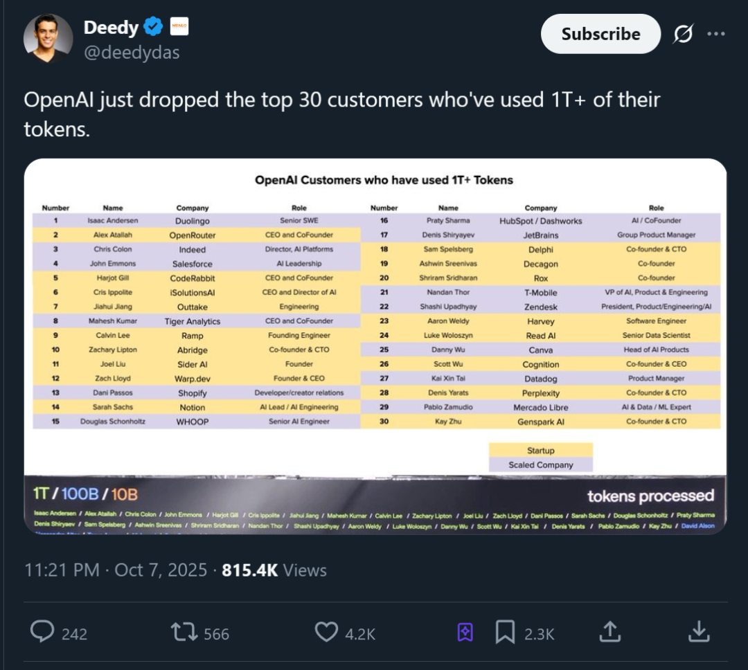 而且需要注意的是,不止谷歌看重“Tokens消耗量”这一指标,OpenAI最近也首次公布了30家Tokens消耗破万亿的“大金主”。
