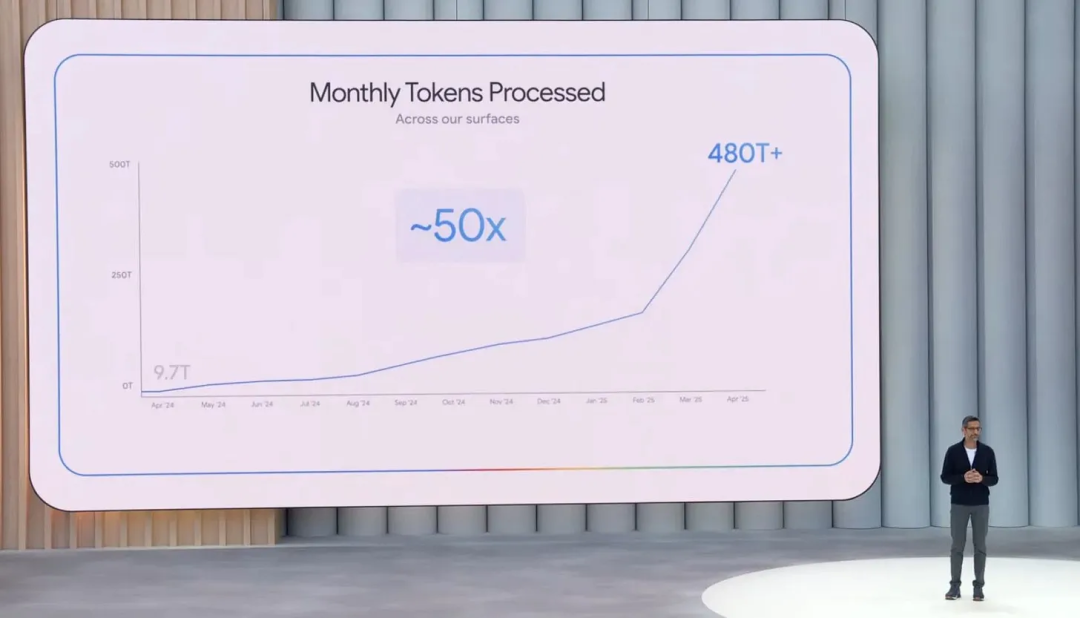 根据谷歌CEO皮猜在今年I/O大会上公布的一张图,一年前谷歌月均处理的Tokens数量才9.7万亿,如今却已突破千万亿级大关。