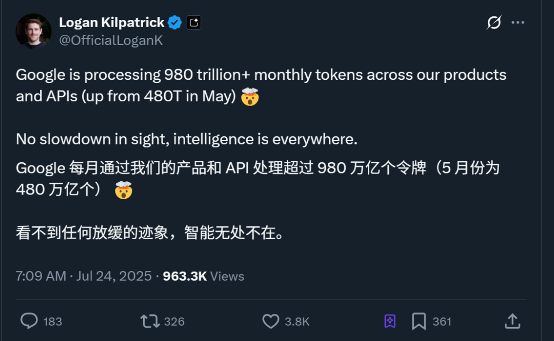 并且,从大会结束到现在,根据Logan Kilpatrick(真实身份为谷歌AI Studio负责人)提供的内部数据,谷歌每月处理的Tokens用量还在连续暴涨,且暂未看到任何放缓迹象。