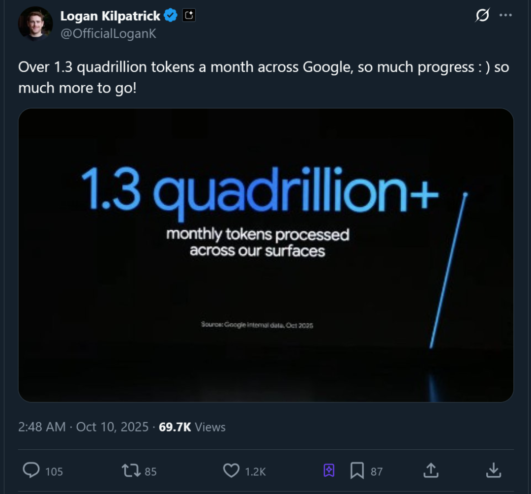 据谷歌“宣传委员”Logan Kilpatrick透露,这一数据来自谷歌对旗下各平台的内部统计。
