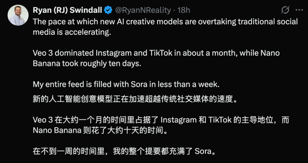 之前Veo3花了将近一个月实现全面推广,Nano Banana则花费十天,而Sora现在只用了一周不到。