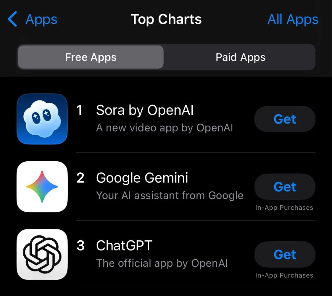 首周结束后Sora也还在持续发力,自10月3日起,其在App Store免费榜单上迅速攀升至第一,超过Gemini和ChatGPT,并一直霸榜前排。