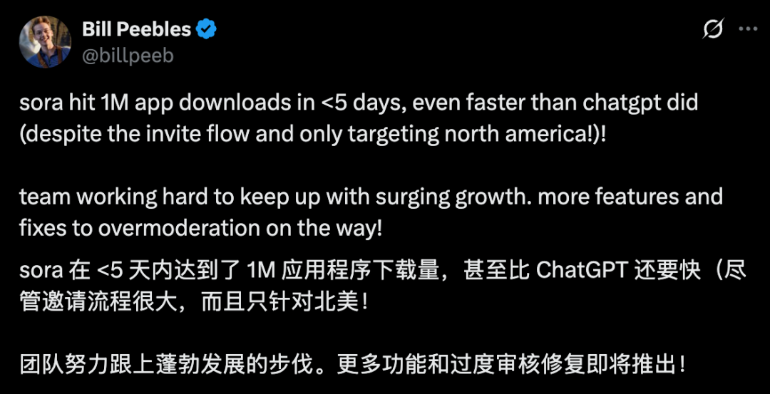 Sora只用了短短五天时间,就成功达成百万下载成就。爆发速度比当初的ChatGPT还要快。