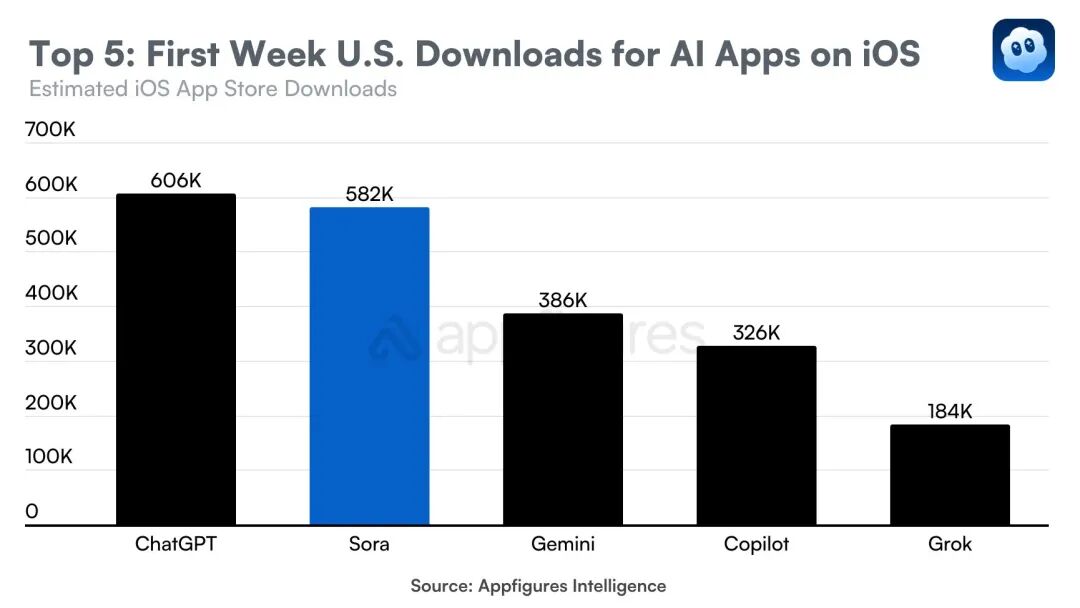 这一点在第三方数据平台Appfigures上也得以证实,据不完全估计,Sora首周收获62.7万下载量,数据持续向好。