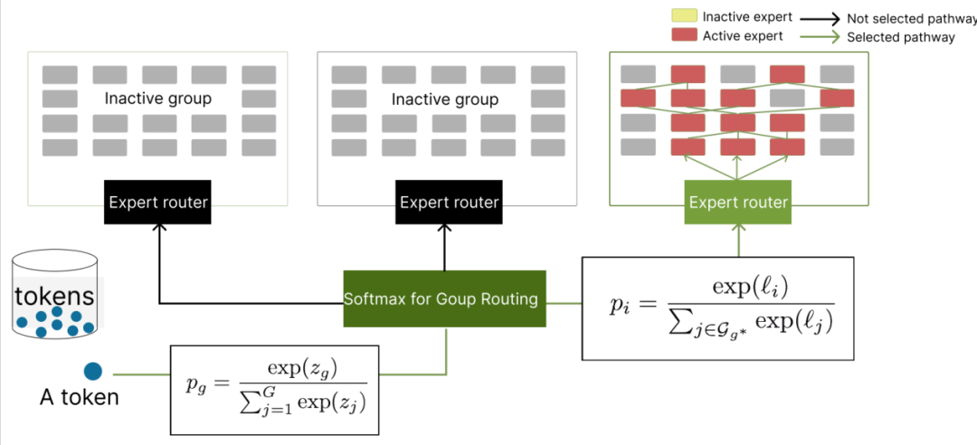 第二阶段:专家级别路由。在选定的簇𝑔*内部,Token x再与该簇内的K个专家的路由权重𝑣𝑖计算相似度,通过另一次Softmax选择最终激活的Top-K个专家。