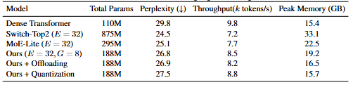 而在启用动态卸载与量化后,模型的内存占用可与标准的稠密Transformer模型相媲美,为在资源受限环境下部署和研究MoE模型提供了可行性。