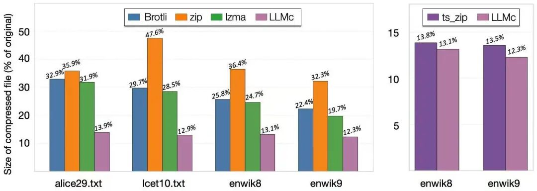 基准测试结果表明,无论是在维基百科、小说文本还是科学摘要等多种数据集上,LLMc的压缩率都优于传统的压缩工具(如ZIP和LZMA)。同时,与其他以LLM为基础的闭源压缩系统相比,LLMc也表现出同等甚至更优的性能。