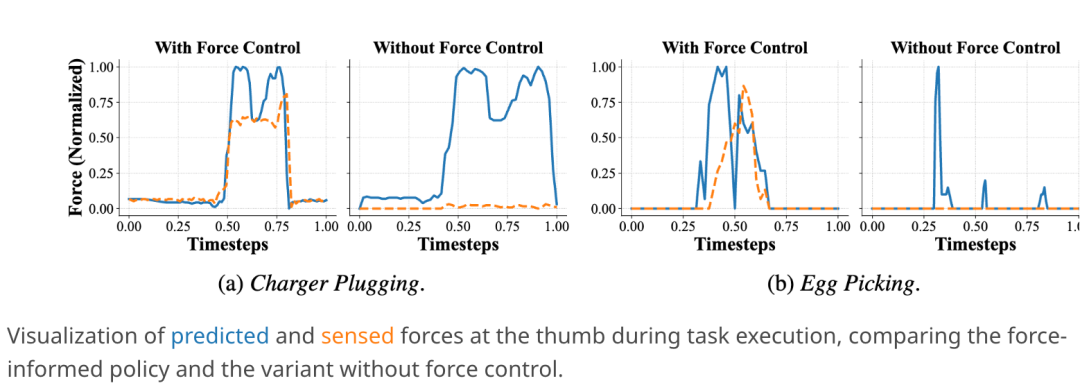 消融实验结果表明,力控模块的缺失会显著影响系统性能。当禁用该模块时,所有任务的平均成功率骤降至16.7%,即使如瓶体抓取等简单任务也难以完成。缺乏力控的灵巧手往往仅接触物体表面而未施加足够压力,导致接触密集型任务频繁失败。
