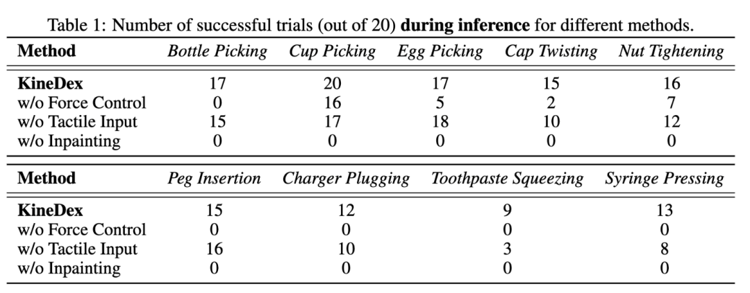在瓶盖旋紧、牙膏挤压、注射器按压等九项复杂任务中,KineDex平均成功率达74.4%,且数据采集效率相较于遥操提升两倍以上。