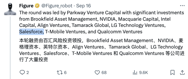 而Figure最新一轮十亿美元融资,Salesforce也参与了。