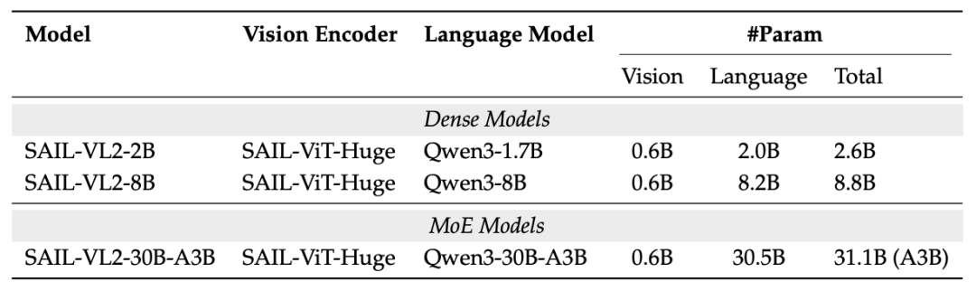 SAIL-VL2突破传统稠密LLM的架构,引入稀疏混合专家(MoE),并提供多规格模型配置,满足不同场景需求: