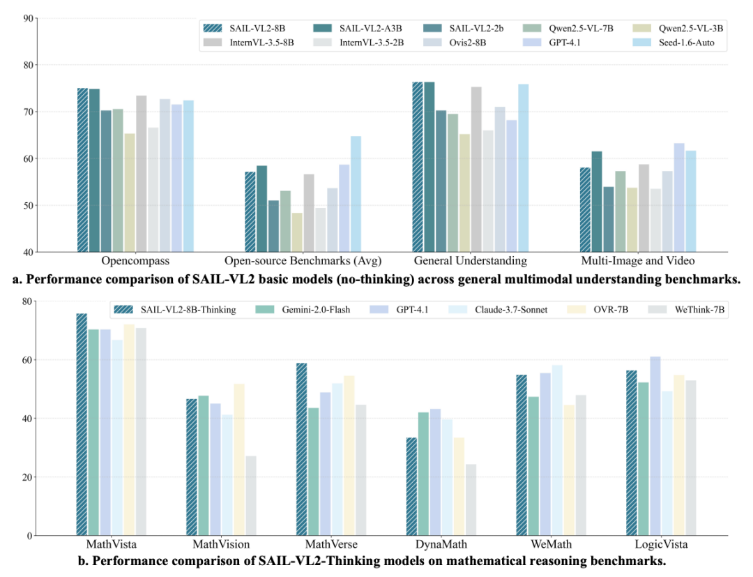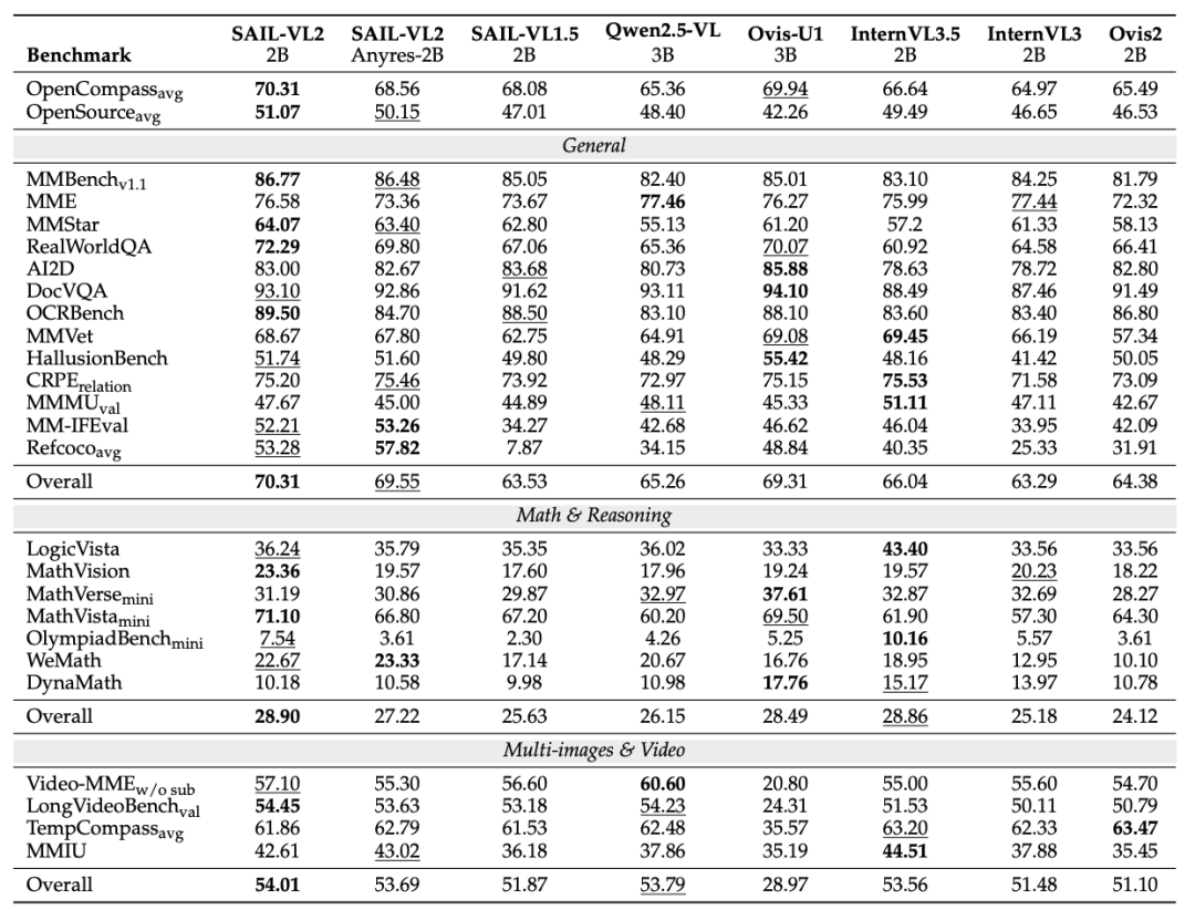 SAIL-VL2-2B OpenCompass为70.31,超越Qwen2.5-VL-3B(65.36)、InternVL3.5-2B(66.64)等模型,位列4B参数以下开源第一;SAIL-VL2-8B在OpenCompass取得开源同量级模型的最高分数: