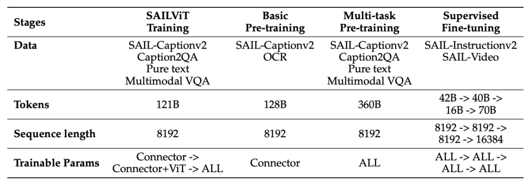 阶段I(热身适应):冻结SAIL-ViT与LLM,仅训练Adapter,使用8M数据激活跨模态映射能力;