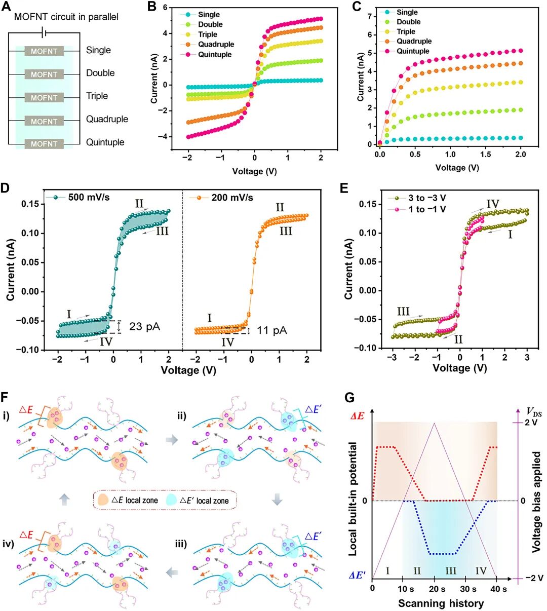 在对两个扫描电压示波器进行相反的扫描顺序时,例如从-2V到2V,再扫描回-2V,h-MOFNT表现出相同的流体忆阻和学习特性,即在一定条件下,器件能够记住过去电压状态。